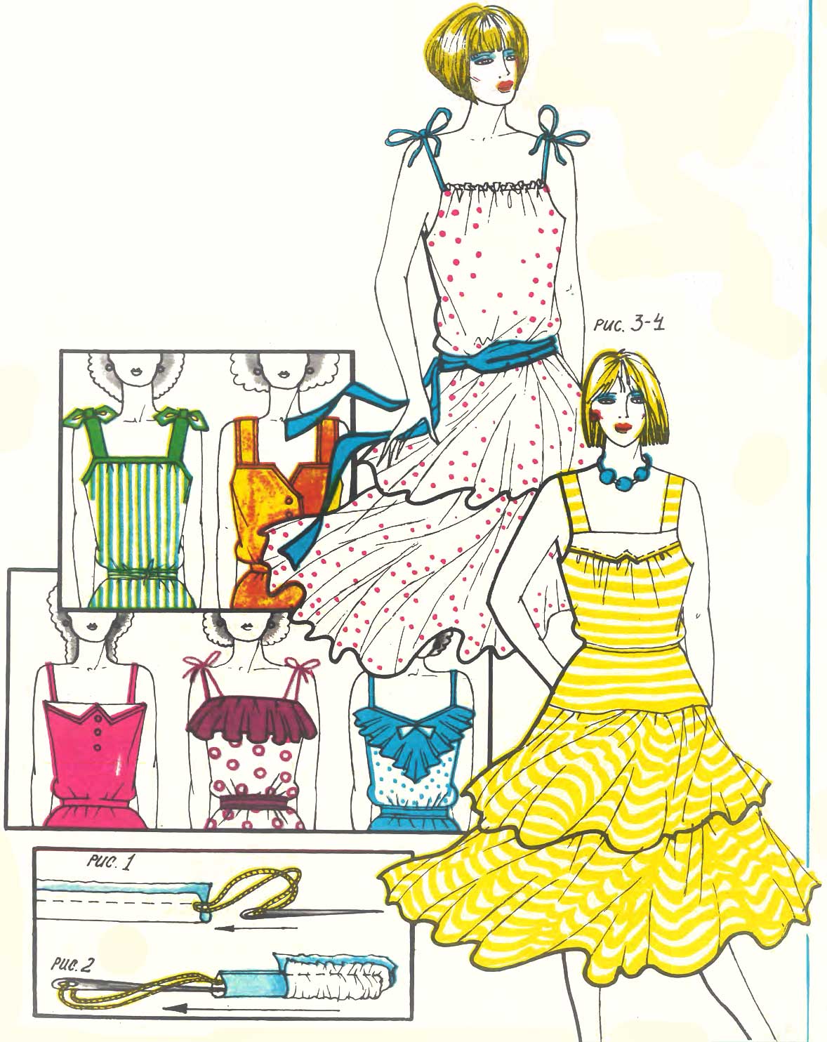 А поскольку эти ткани хорошо комбинируются между собой, то прикиньте, как они сочетаются по тону и узору. Лиф можно украсить оборками, воланами, рюшами, отворотами, складочками, юбку пришить карманы, повязать цветные пояса.