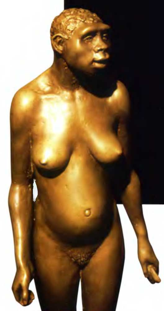 Посмотрим на эту красотку - предка наших женщин. Ростом Люси была около метра. На черепе - гребень, крепящий мощную жевательную мускулатуру. Зубы Люси - это зубы всеядной обезьяны с выступающими клыками. Таз у Люси узкий, как у самца. Все это означает, что у афарского австралопитека самка ни в чем не уступала самцу - бегала так же быстро, рваные раны зубами наносила столь же серьезные.