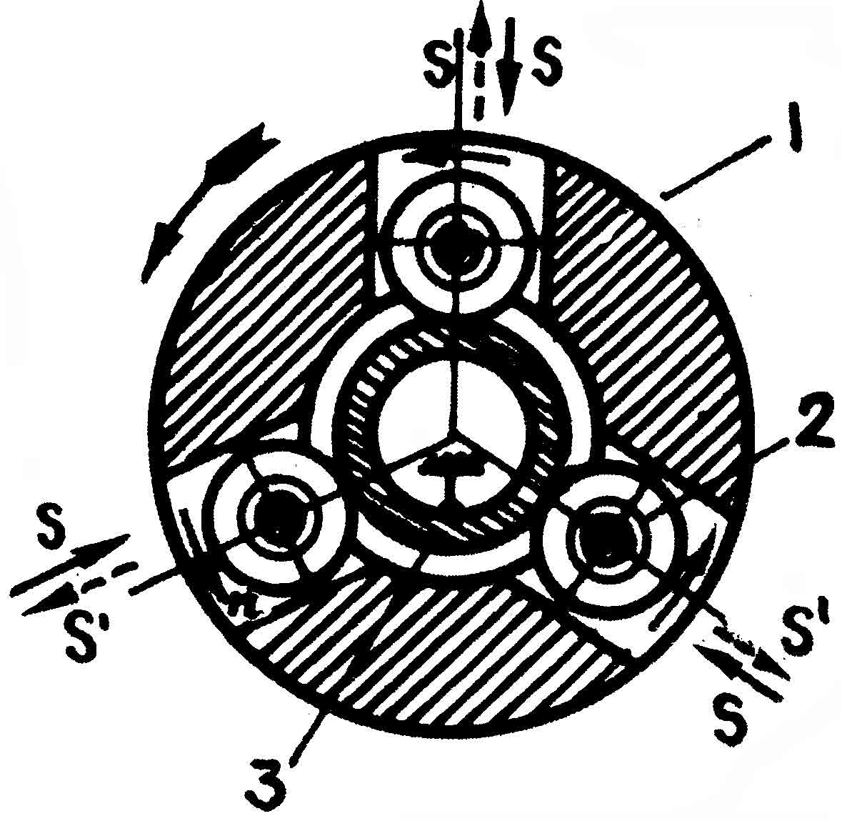1 — вращающаяся отрезная головка; 2 — отрезные ролики; 3 — разрезаемая труба.