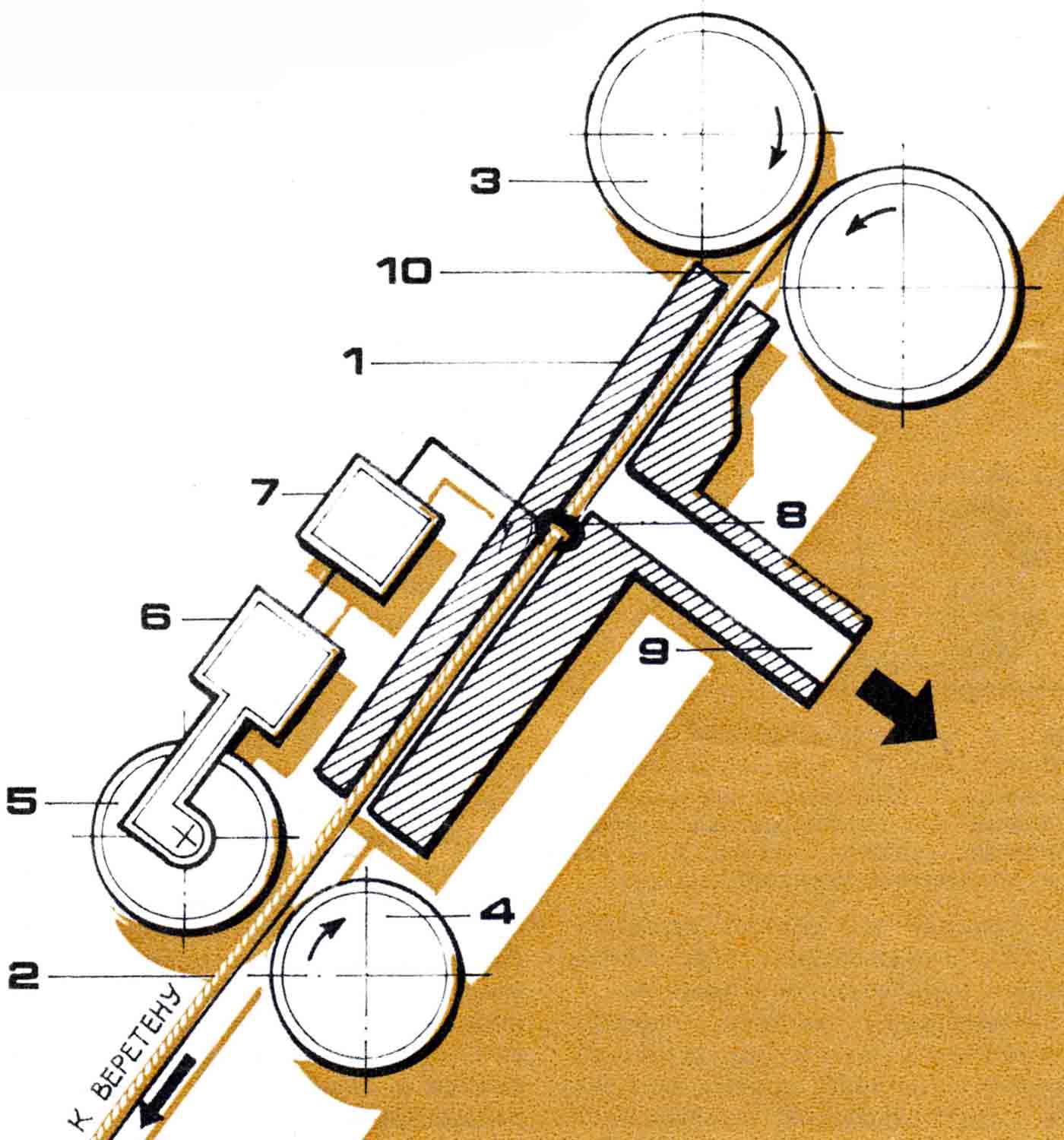 На последнем этапе, когда мычка выходит из вытяжного прибора и начинает, закручиваясь, превращаться в нитку, из-за неравномерного, а иногда и чрезмерного натяжения она обрывается. Ликвидация каждой такой микроаварии требует от прядильщицы затрат времени и нелегкого труда. Ведь чтобы устранить обрыв, она должна выполнить несколько операций: остановить вращающееся веретено со шпулей, отыскать конец оборвавшейся нити, завести ее в нитепроводник, заправить под бегунок, соединить с концом мычки, скрутить их между собой (присучить).