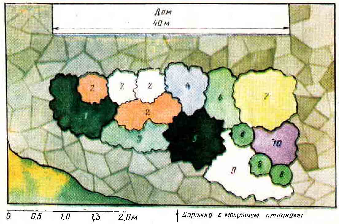 План цветника, расположенного в тени, у северной стены дома. В скобках указано количество экземпляров в группе. Краски соответствуют пику цветения в июле.
