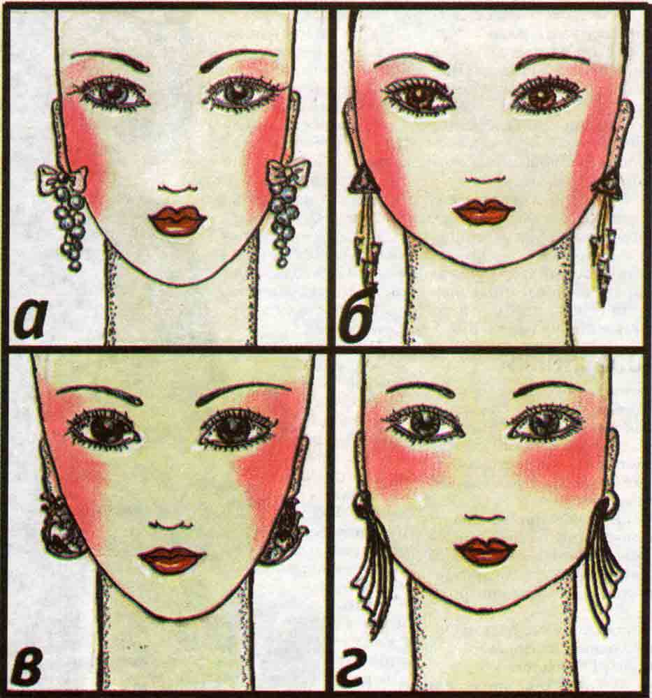 Корректировка формы лица при помощи румян: а - овальное лицо, б - круглое лицо, в - треугольное лицо, г - квадратное лицо