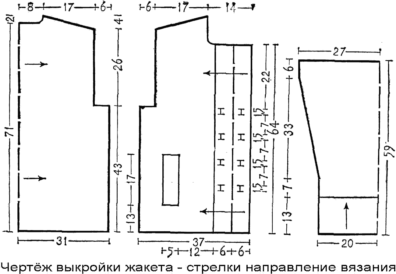 Сборка. Готовые детали наколите на выкройку и прогладьте через влажную марлю. Сшейте плечи и рукава до резинки на швейной машине. Резинку сшейте по лицевой стороне тонкой нитью. Распустите хлопчатобумажные нити. Сшейте боковые швы жакета и вшейте рукава трикотажным швом с изнаночной стороны. Все швы разутюжьте. К карманам подшейте мешковину. Пришейте воротник к горловине, отступив 6 см от края планки.