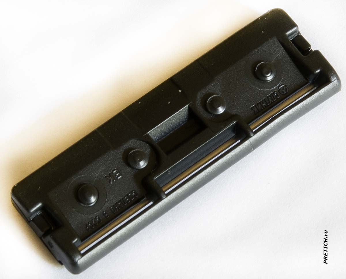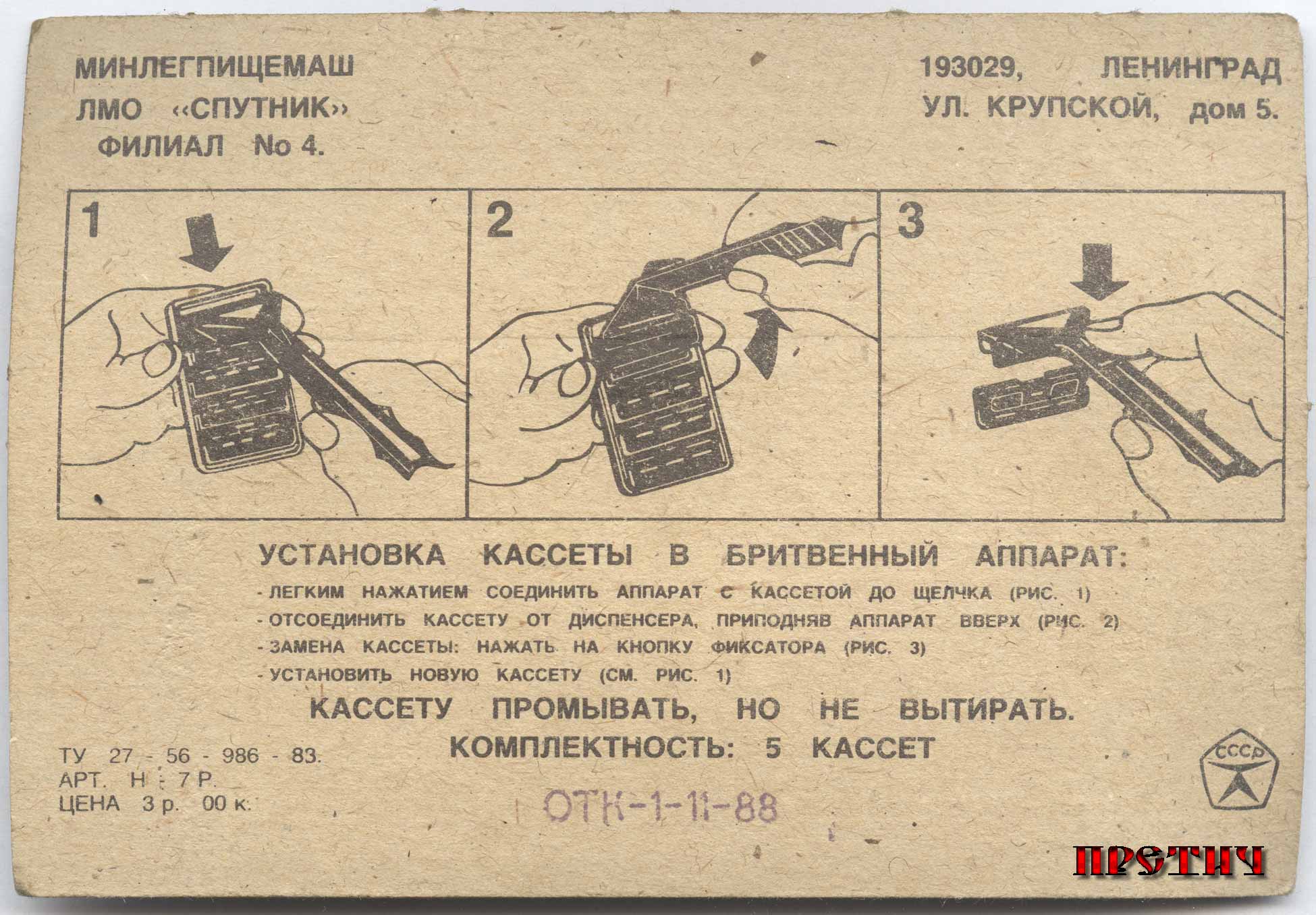 Ниже схематично нарисована инструкция по установке кассеты в бритвенный аппарат. Также инструкция дана и в текстовом варианте. Предупреждение: Кассету промывать, но не вытирать. Указаны техусловия - ТУ 27-56-986-83. Артикул Н 7Р. Цена 3 рубля 00 копеек. Знак Качества. Штамп ОТК и дата изготовления 1 ноября 1988 года.