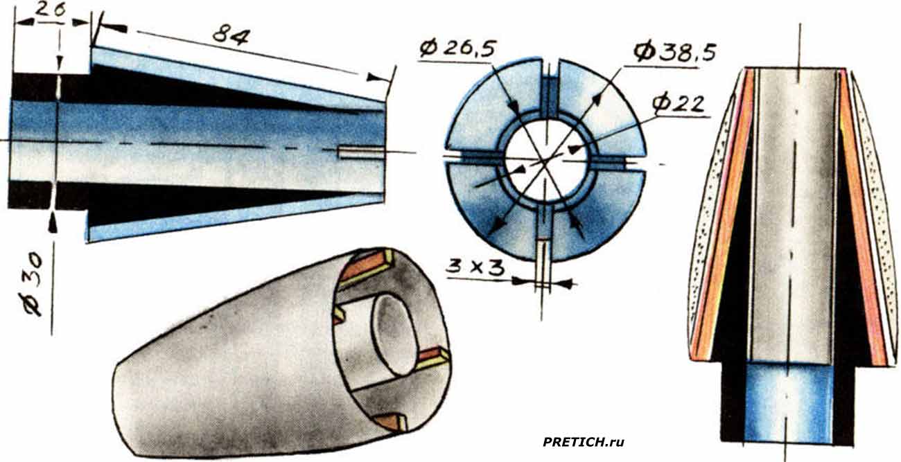 Для того чтобы корма модели отвечала всем перечисленным требованиям, мы разработали конструктивно - технологическую Схему, по которой корма состоит из стакана для двигателя, конуса, четырех лонжеронов, нижнего шпангоута и обрезков бальзы в обкладке конуса, чтобы получилась поверхность двойной кривизны. Для изготовления этих деталей необходима технологическая оснастка: оправки — цилиндрическая для стакана, коническая для конуса и стапель для сборки всех деталей и их окончательной механической обработки.