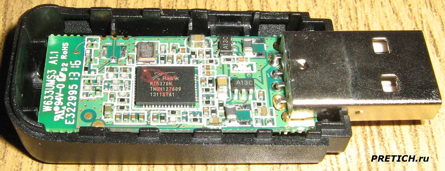 This Wi-Fi adapter is based on widespread, inexpensive chip Ralink RT5370N. Ralink Company was founded in the United States, then moved to Taiwan in 2011 and bought all the Taiwanese MediaTek ... This chip - SOC processor with Support USB2.0 for 802.11n Wi-Fi, with data transfer rates up to 150 Mbit / s. The adapter has an internal antenna - a serpentine path on the reverse side, the range of the 200 meters.