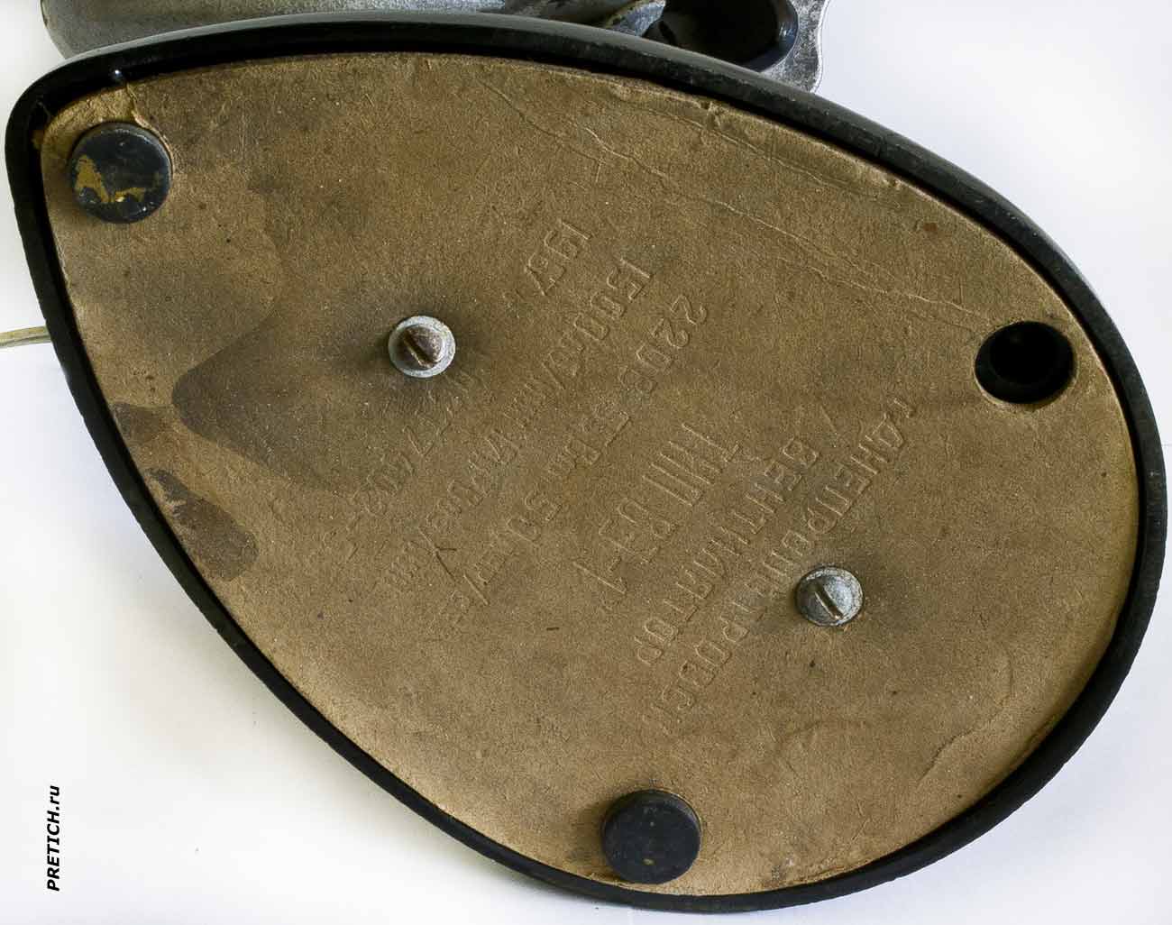На нижней части основания картонная пластина, притянутая двумя винтами, на ней три резиновые ножки (у меня, как видно из фото, одной ножки также нет)... Некоторые серии этих вентиляторов шли с металлическим дном. Здесь мы видим все данные на изделие, которые выбиты: г. Днепропетровск. Вентилятор тип ВЭ-1, 220В 55 Вт 50 пер/сек. 1500 об/мин 17м3 Воз/мин. 1967 г. ГОСТ 7402-55