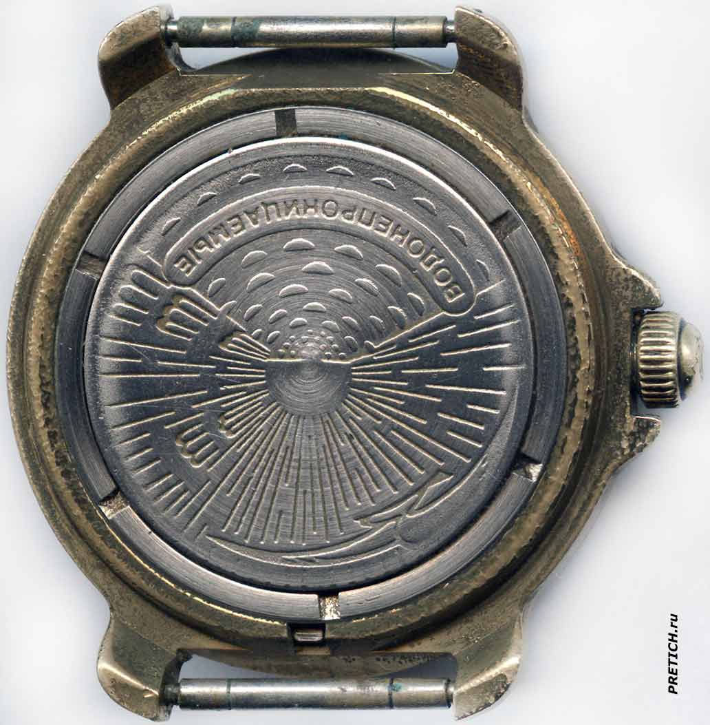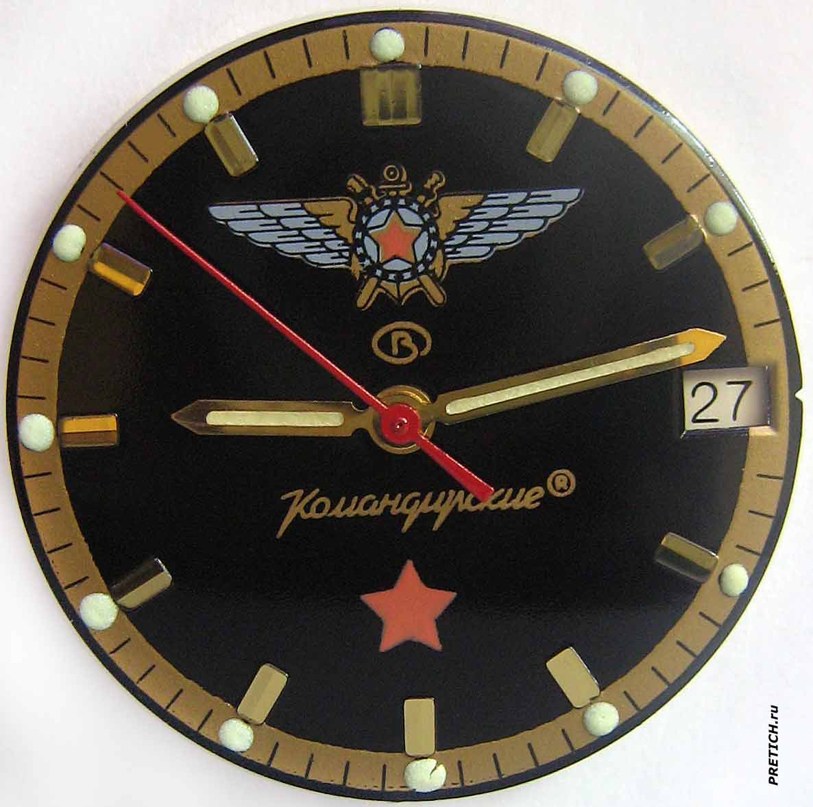 На циферблате нанесены, сверху: знак морской авиации - крылышки, посередине круглый щит с красной звездой, за ним два скрещенных меча и якорь. Это стилизованный нагрудный знак еще советского времени, который использовался некоторое время и в РФ... Ниже знак завода Восток. Ниже стандартной прописью название часов - Командирские, но с буквой R в кружке. Еще ниже - красная звезда.