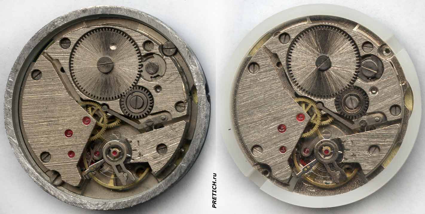 А вот под ним: один механизм имеет тот же самый полиэтиленовый пенал - кольцо по краю, правда никак не закрепленное. Во вторых часах, с хромированным корпусом, мы видим алюминиевое кольцо, которое прижато шляпками двух винтов...