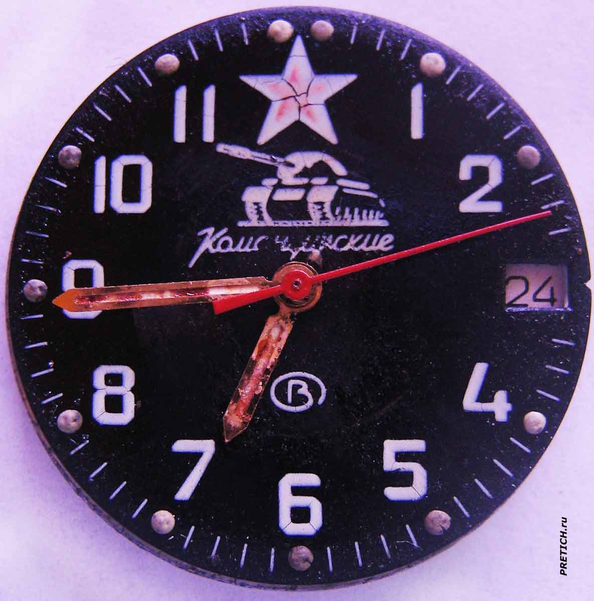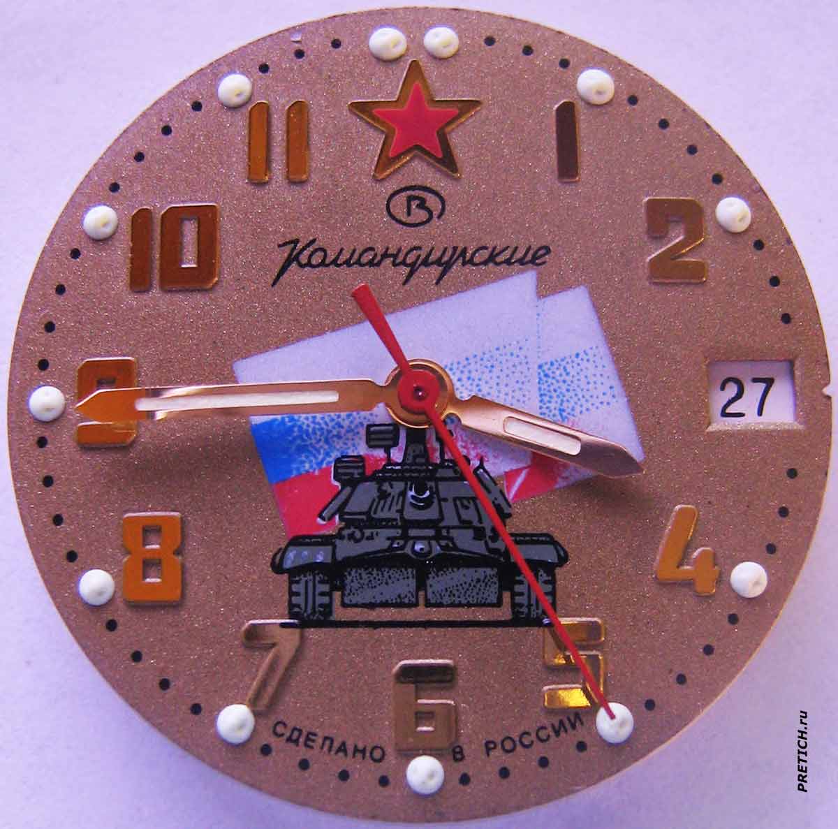 Циферблат часов Командирских в хромированном корпусе: черного цвета. Арабские цифры и разметка нанесены белой краской. Часовые отметки по краю имеют кружки, нанесенные светящейся в темноте краской. Вместо цифры 12 - белая пятиконечная звезда, над ней две светящиеся точки. Вместо цифры 3 - окно календаря. Стрелки желтого цвета, позолоченные, с прорезями в которых светящийся состав. Кроме секундной стрелки - она красного цвета и не светиться. Под звездой нарисован танк и прописью название - Командирские. В нижней части циферблата только логотип завода "Восток".