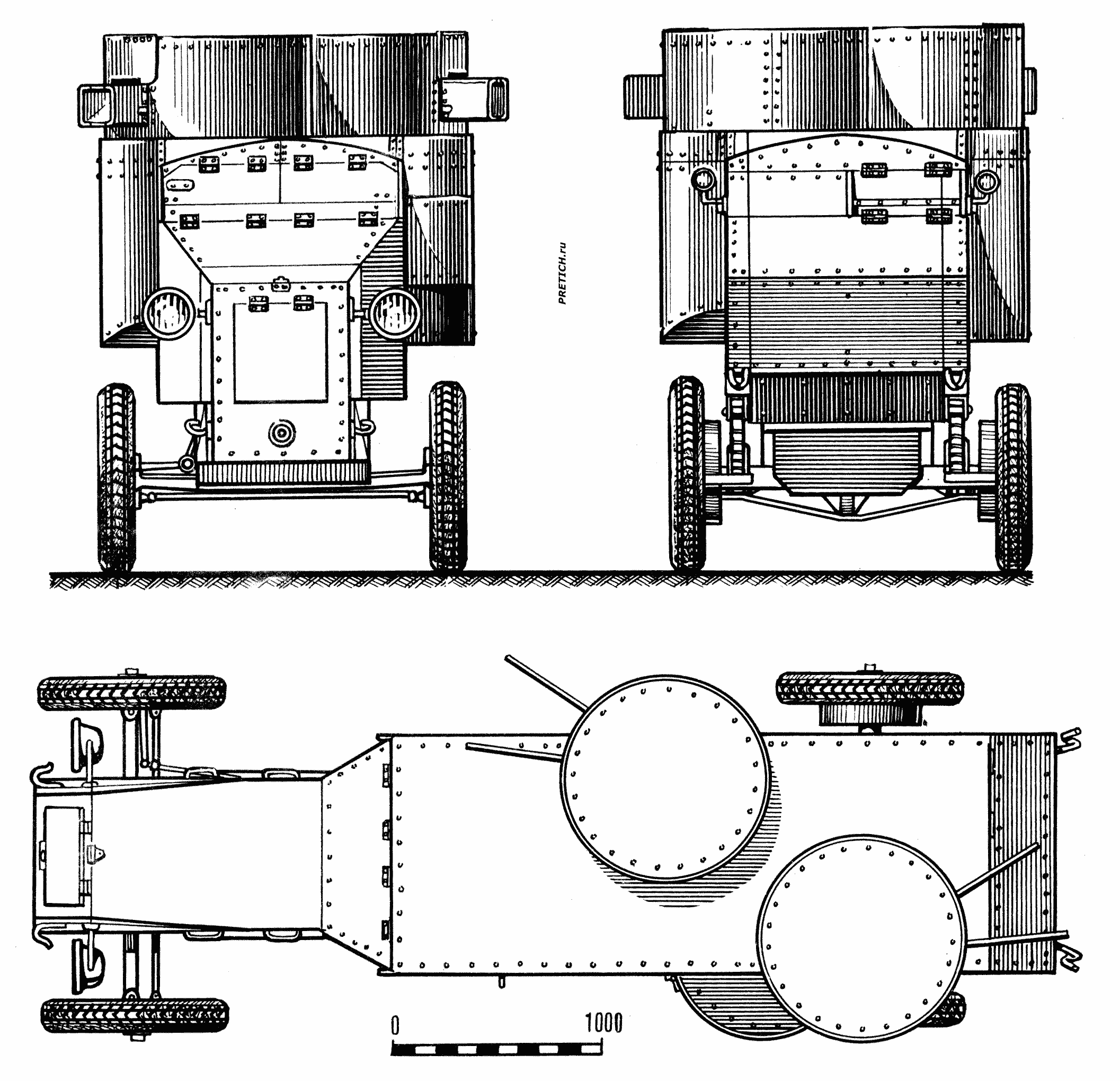 Общий вид броневика дан на рисунке 1 (выше), а чертежи «вид сверху», «спереди» и «сзади» на рисунке 2.