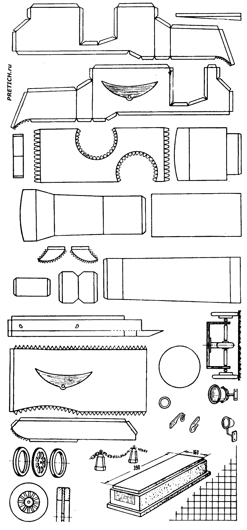 Начинающим моделистам советуем изготовить упрощенный макет из плотного гладкого картона толщиною не более 1—2 миллиметров. Раскрой деталей корпуса (рис.) с помощью копировальной бумаги, линейки и угольника переведите на картон. (Наиболее простой и современный способ: распечатайте на принтере чертёжик, с необходимым вам увеличением, так же можно увеличивать чертёж на ксероксе. Далее, увеличенную копию аккуратно вырезают ножницами, приклеивают на картон а далее вырезают уже сам картон).