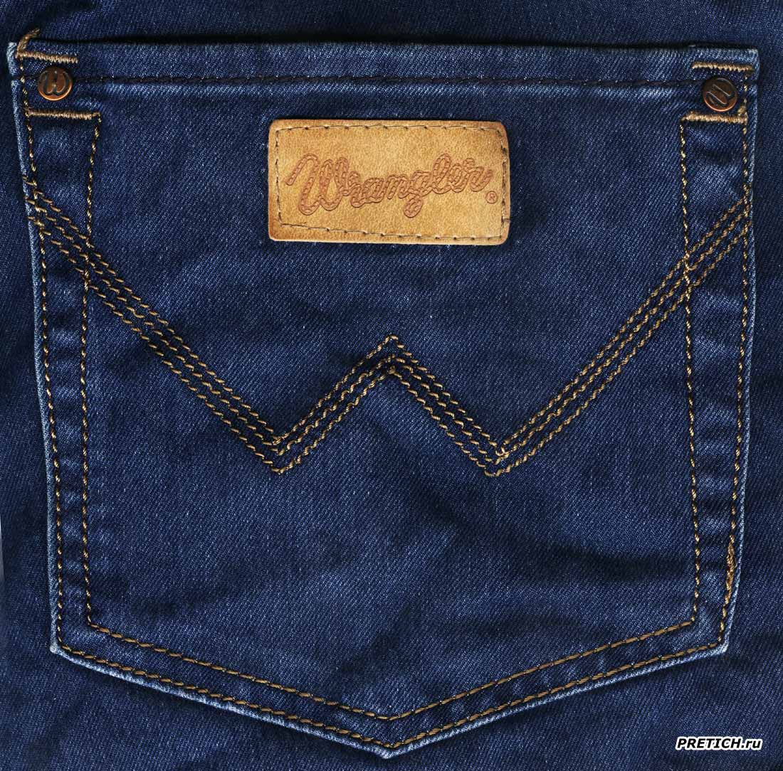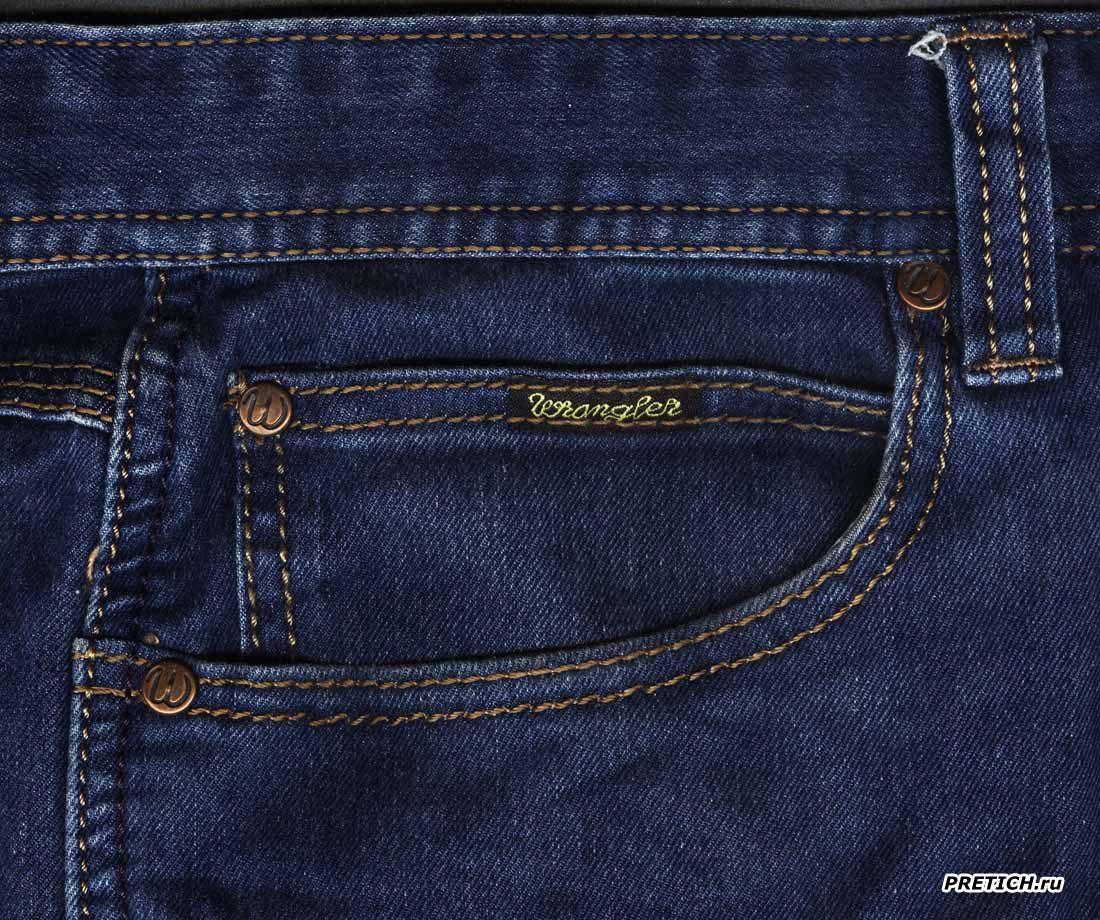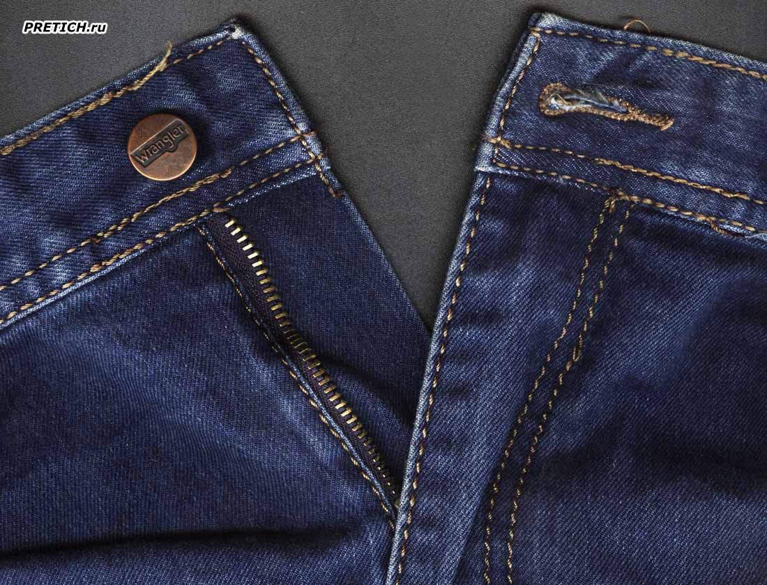 Ширинка имеет металлическую молнию, пуговица с латунной накладкой, на которой выбит логотип Wrangler.