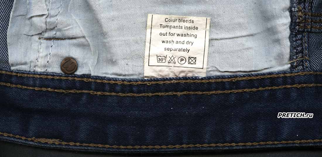 Изнутри. Передние карманы из светлой ткани. На поясе изнутри вшит только один ярлык. С одной стороны его правила стирки и ухода за изделием...
