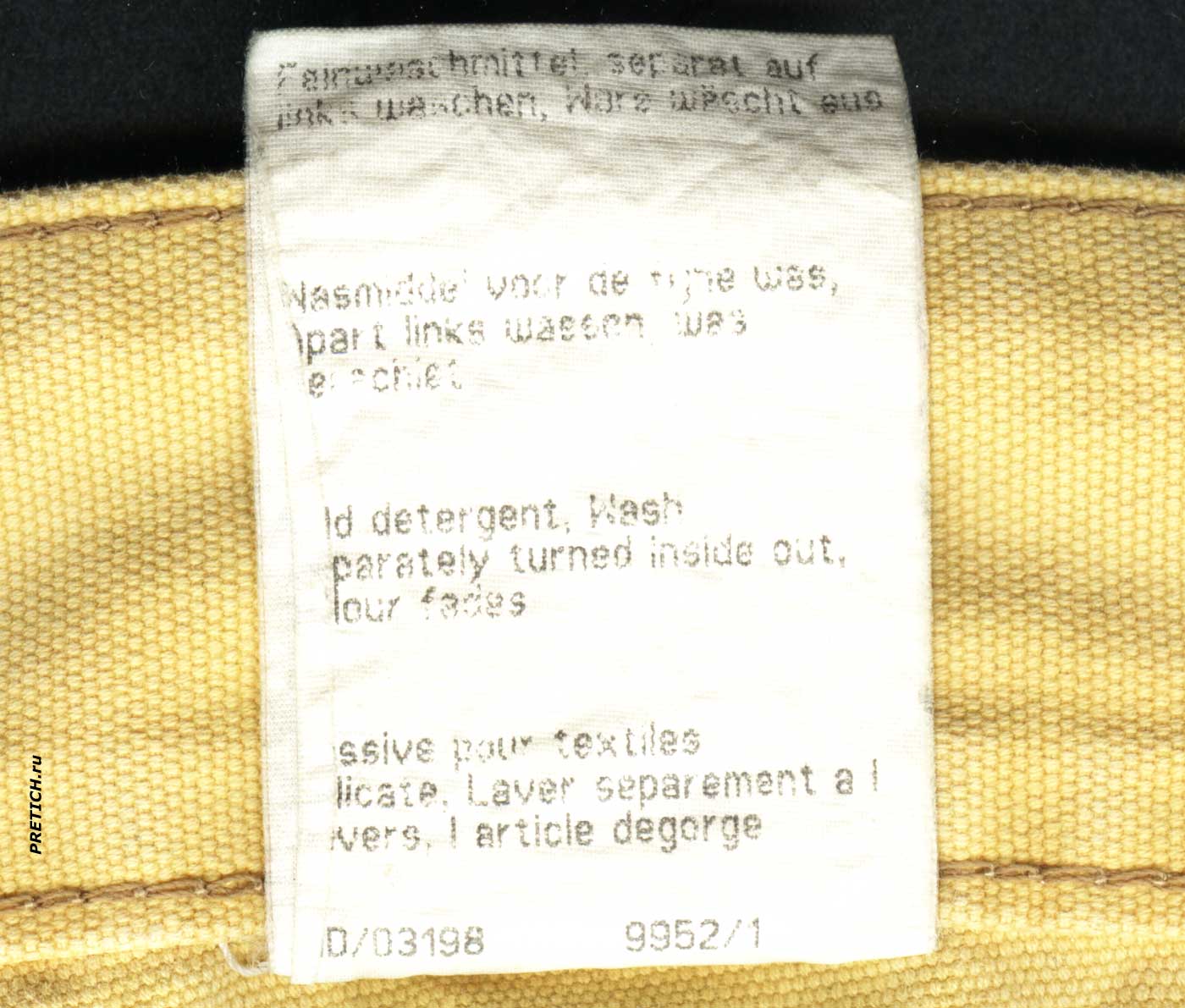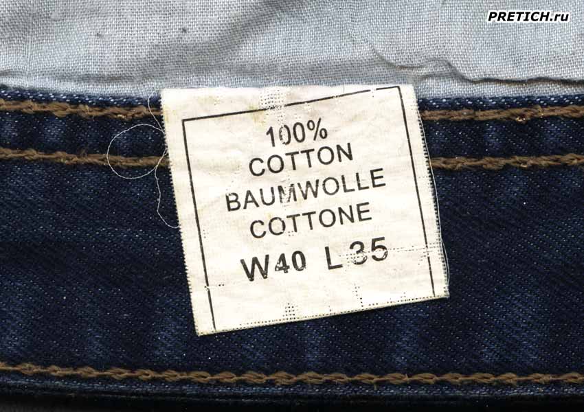 С другой стороны на ярлыке: 100% COTTON BAUMWOLLE COTTONE - значит чистый хлопок. Затем размеры: W40 L35 - что соответствует: обхват талии 102-105 см, длина по внутреннему шву более 86 см. Одним словом, почти для двухметрового мужчины... Именно поэтому они и сохранились в идеальном состоянии до наших времен.