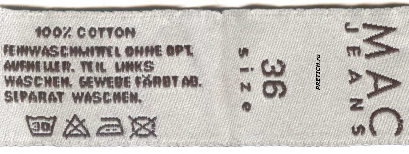 Это еще один шильдик. Здесь имя MAC Jeans, размер - 36 size. 100% cotton... указания по стирке и глажению. Страна изготовления не указана...