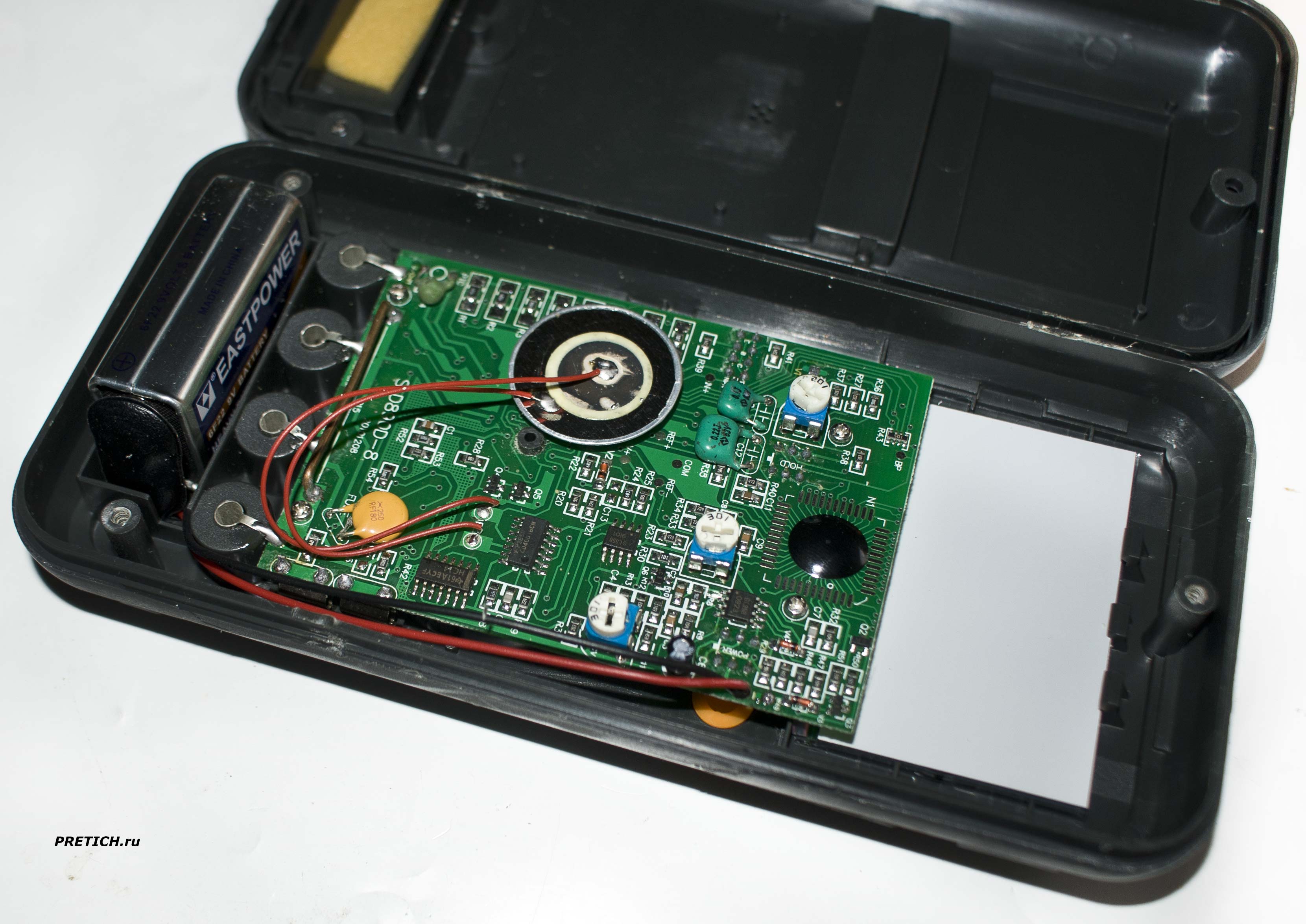 Внутри обычная картина... плата электроники, батарейка, дисплей... Я сперва хотел провести полную разборку, но потом передумал... Нужно была паять - четыре гнезда, куда вставляются щупы, они припаяны к плате, но вылезать из пластмассового корпуса не хотели... К тому же ЖК-экран подсоединяется к плате через полоску токопроводящей анизотропной резины, что тоже может обернуться геморроем при обратной сборке... Так что полная разборка временно отложена, смотри на то, что доступно.