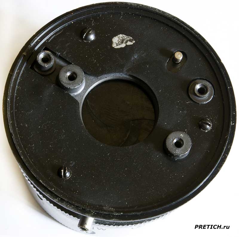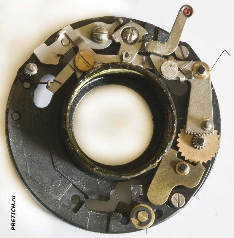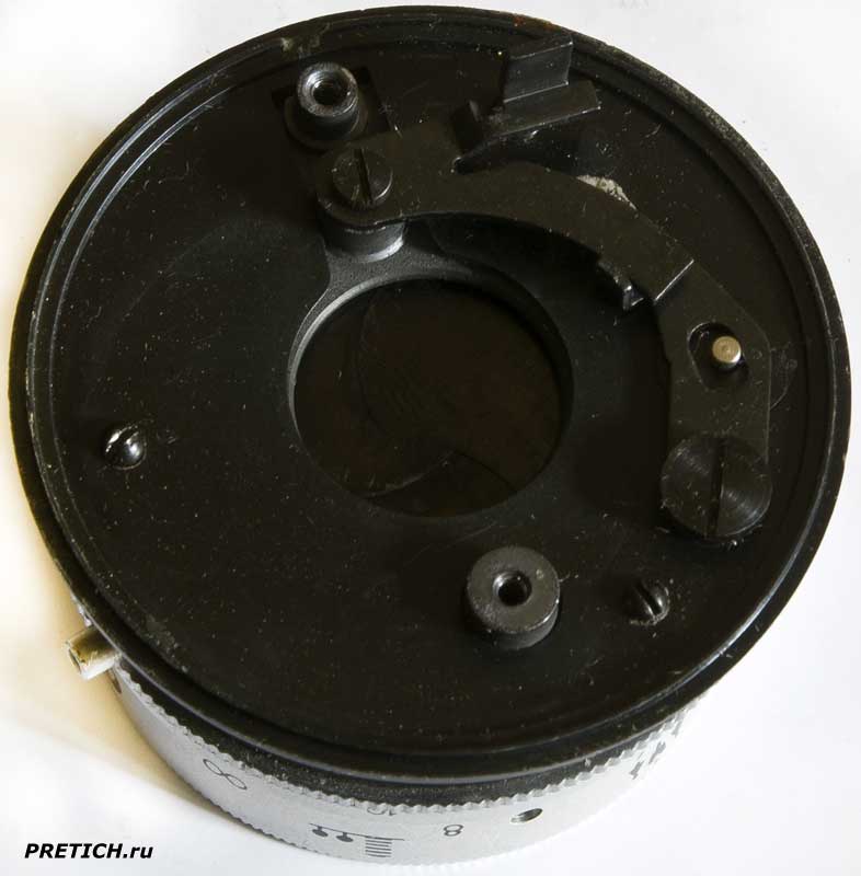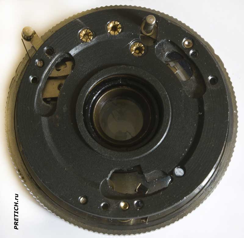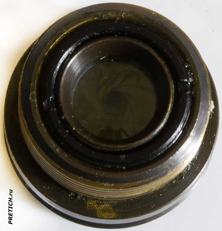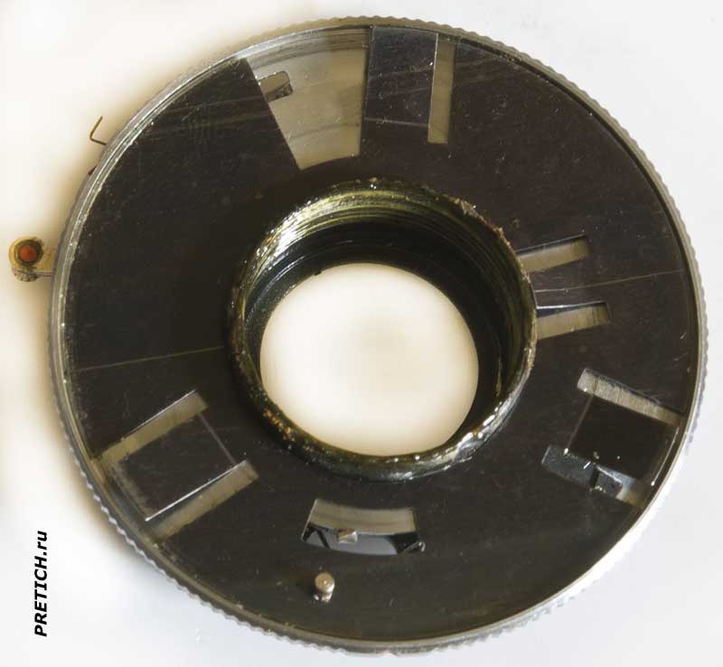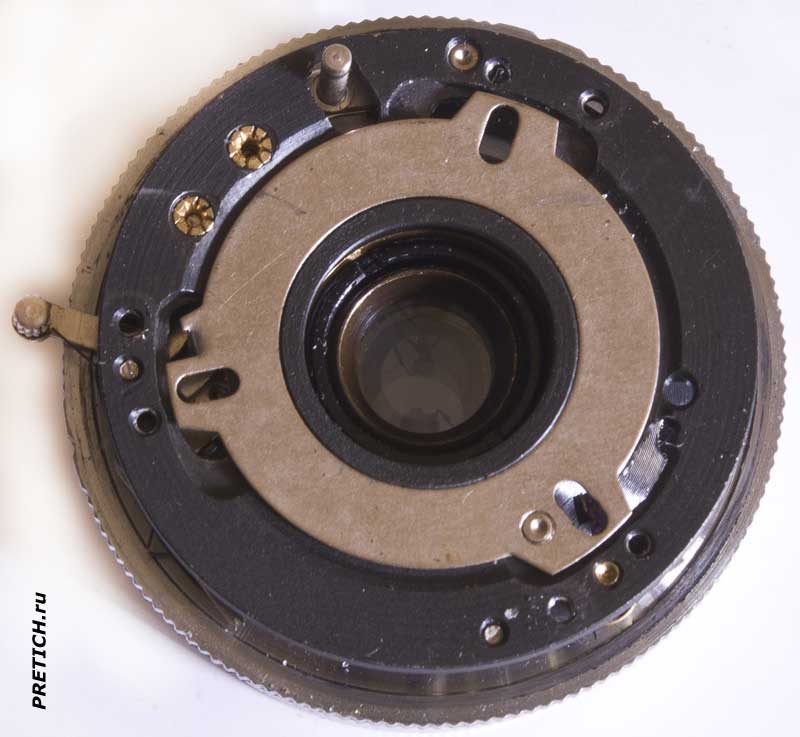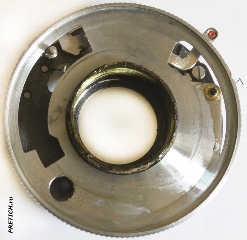 Алюминиевый корпус затвора, посередине видим лепестки затвора... Снимаем и его - обратная сторона.