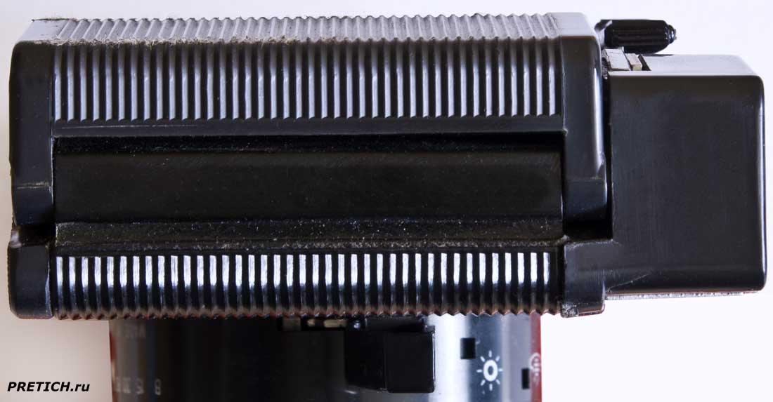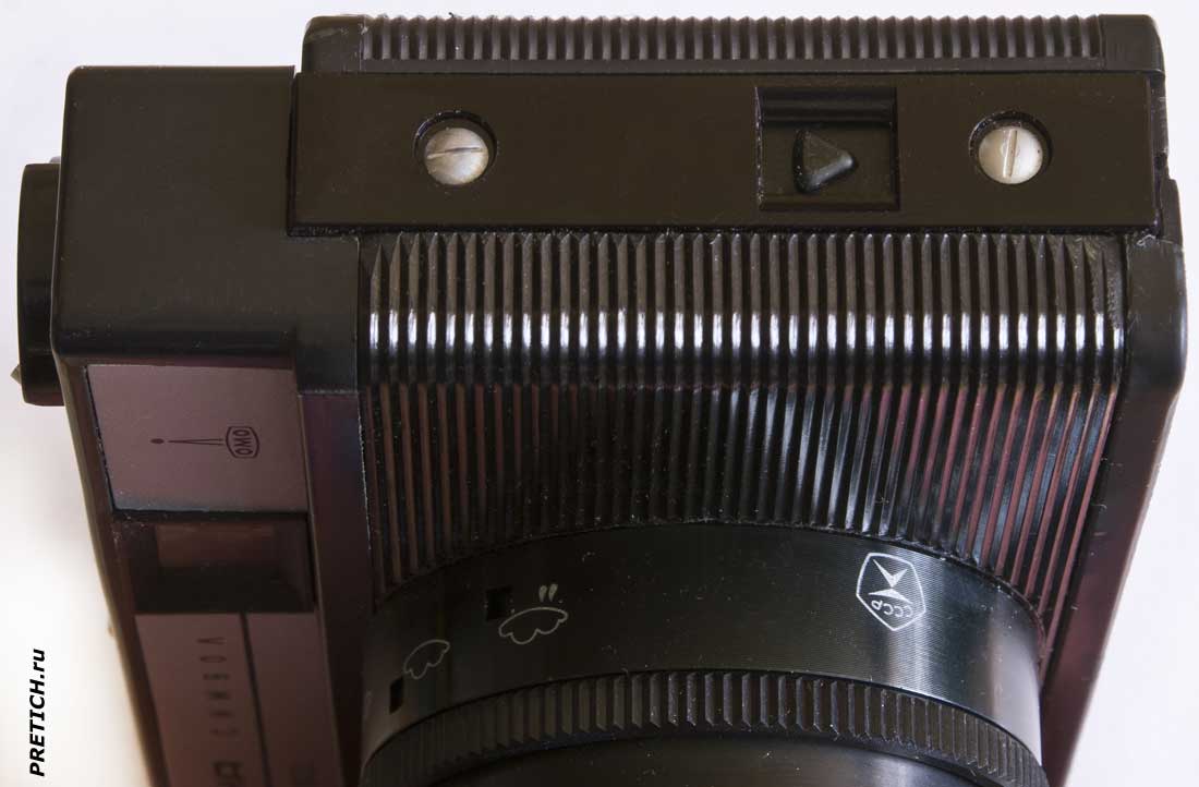 На верхней стороне стандартное установочное место для фотовспышки, с контактом синхронизатора посередине. И одно пластмассовое колесо с металлической откидной рукоятью - для сматывания фотопленки назад.