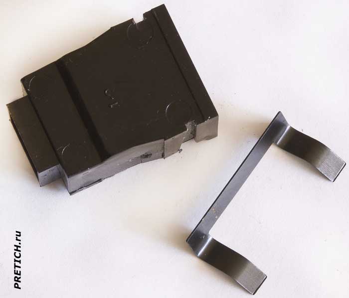 Замок задней крышки - пластмассовая накладка держится на двух винтах, внутри подвижный стопор - из алюминия, с черным покрытием, пружина...