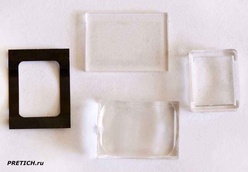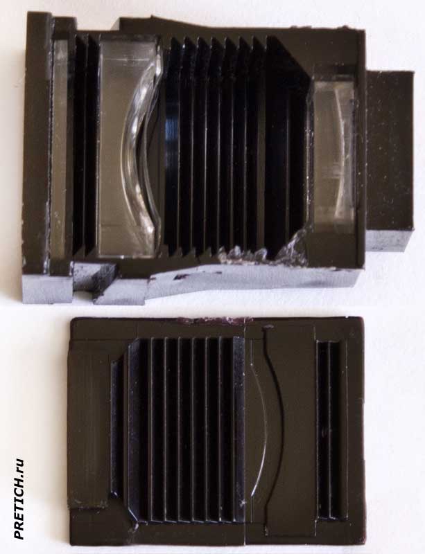 Видоискатель - пластмассовый прямоугольник, к корпусу закрепляется с помощью металлической скобы. С его одной стороны можно снять боковушку. Внутри две пластмассовые (оргстекло) линзы... и такое же защитное стекло...