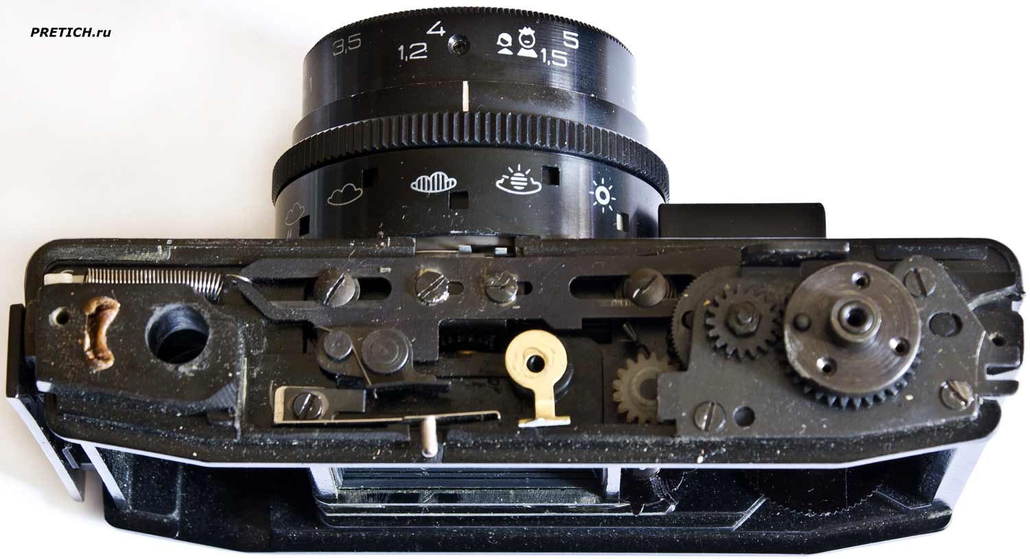 А на самом фотоаппарате под этой крышкой... да уж - это вам не простенькая Смена-8М. Все более усложнено... Но выполнено аккуратно и качественно.