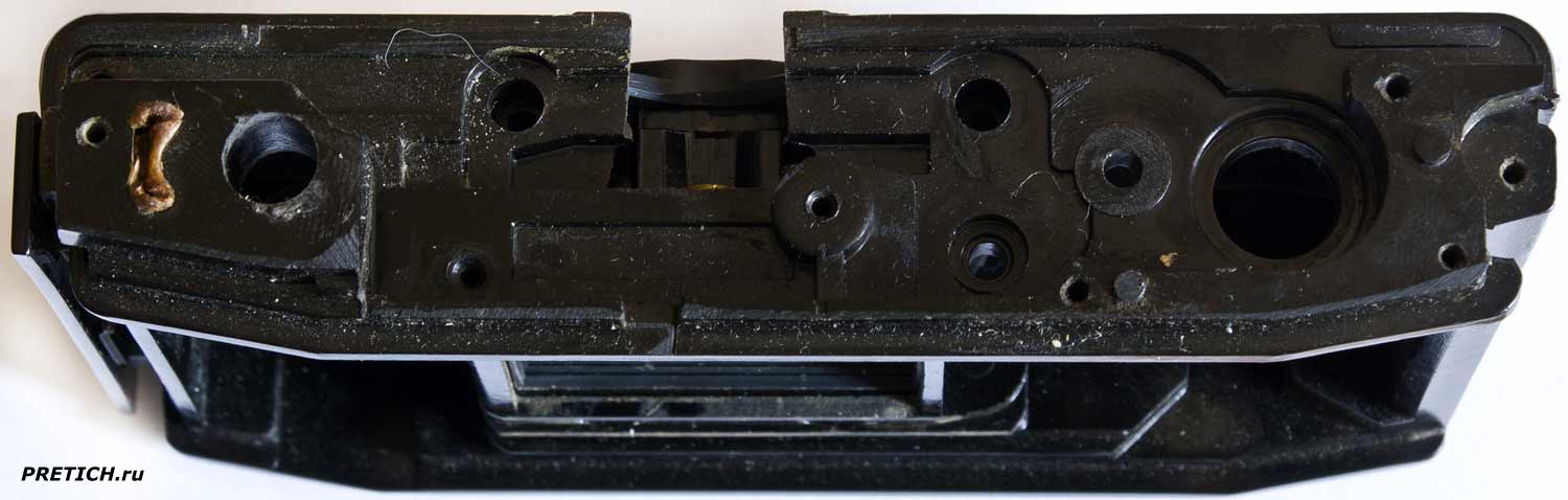 Вот так она выглядит изнутри: контакты синхронизатора фотовспышки, видоискатель в пластмассовом корпусе, и нижняя часть ручки перемотки... Пластмасса мягкая и хрупкая - если вы внимательно посмотрите на фото, увидите трещину, хотя этим аппаратом пользовались очень немного...