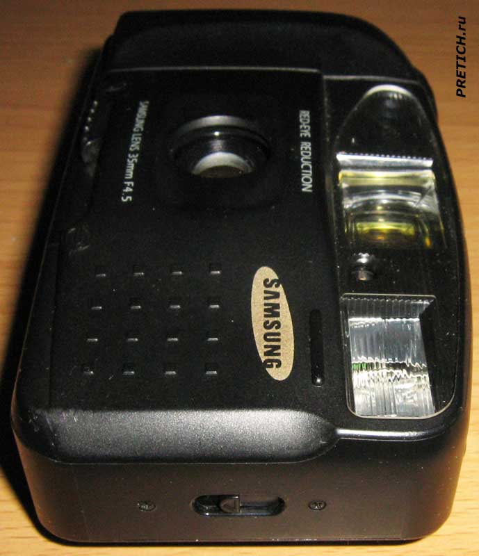 Итак, фотоаппарат сделан из черной матовой пластмассы. На передней стороне: по центру маленький объектив, он закрывается защитной шторкой, которая открывается и закрывается вручную ползунком в нижней части аппарата. Под объективом надпись: SAMSUNG LENS 35mm F4.5, а над объективом RED-EYE REDUCTION. Выше окно видоискателя, с одной стороны от него небольшое отверстие - там фоторезистор, он определяет уровень освещенности, с другого - светодиод, он обеспечивает функцию "антикрасных глаз"... Ну и фотовспышка.