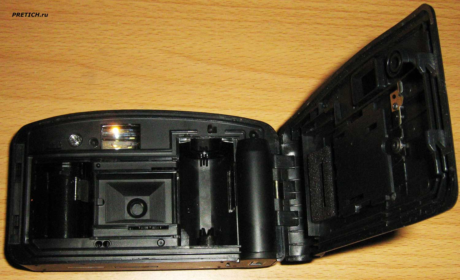 Открываем крышку, смотрим внутрь - все просто, даже примитивно... слева барабан, на него наматывается фотопленка из кассеты. Кассета вставляется справа...