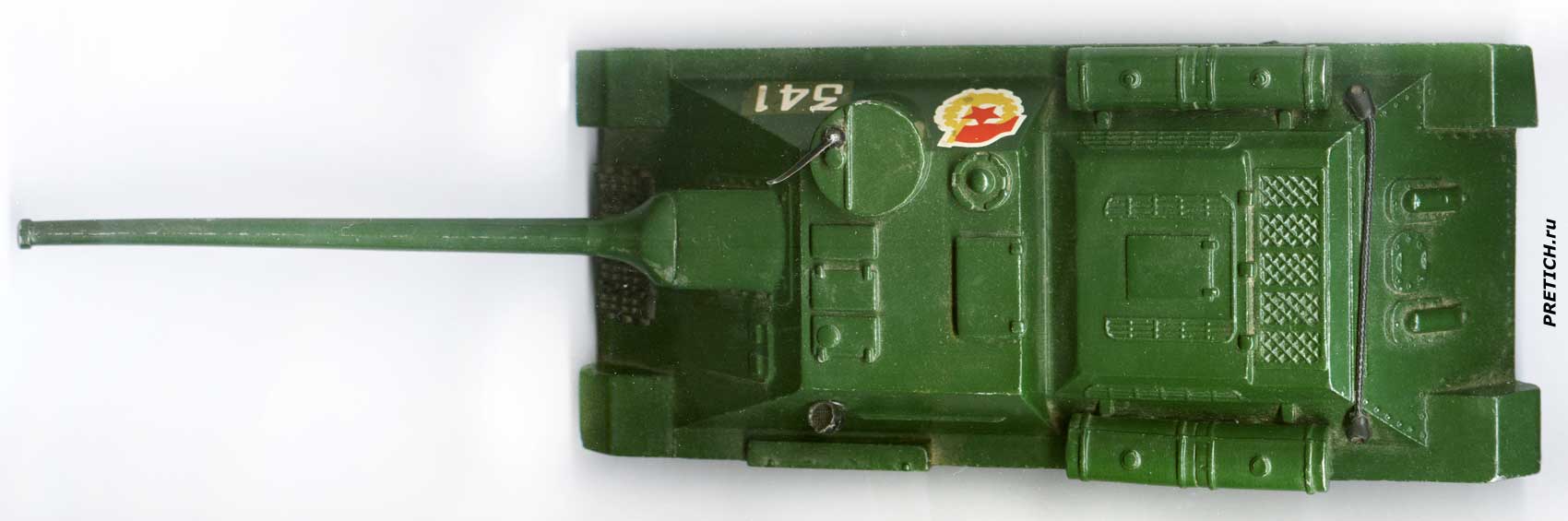 Сама модель-копия СУ-100, ее вы можете видеть на фото. Корпус металлический - отливка из какого-то алюминиевого сплава, вероятно. Корпус состоит из двух половинок - верхняя и нижняя. Пушка подвижная - на несколько градусов вверх-вниз. На командирской башенке пластмассовая антенна. Сбоку пластмассовая фара черного цвета, тоже поворотная. На корме установки закреплен трос, тоже из черной пластмассы. Катки пластмассовые, по виду как у Т-34 и у исходного оригинала (в 60-х годах на эти машины ставили опорные катки идентичные танку Т-44). Конечно, резинового бандажа на них нет. Гусеницы сделаны из той же черной пластмассы, похожей на резину. Есть и четыре запасных трака, на лобовой броне под пушкой (как часто было и на оригинальных машинах). Сбоку нанесен номер машины - 341 и знак "Гвардия". Окраска стандартная для советской бронетехники - темно зеленая. Но были модели и других цветов...
