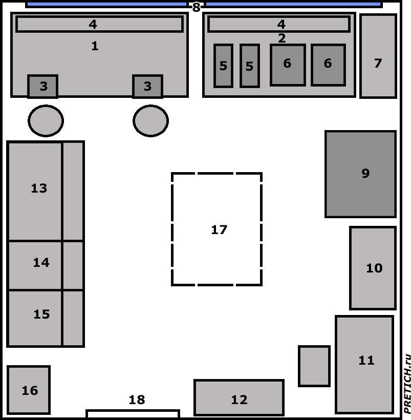 На схеме цифрами обозначено: 1 - первый верстак для двух работников; 2 - второй верстак; 3 - тиски и стулья рядом; 4 - небольшие полки с выдвижными ящичками; 5 - пластины из свинца и латуни; 6 - доводочные плиты 400х400; 7 - стальной ящик со списанным инструментов (в очереди на разборку для запчастей); 8 - окно (кондиционер и вытяжной вентилятор не указаны); 9 - гранитная поверочная плита; 10 - шкаф с поверочным инструментом, документацией и расходными материалами; 11 - канцелярский стол и стул для ремонта часовых индикаторов; 12 - стеллаж с отремонтированным и вновь прибывшим инструментом; 13 и 14 - сварной стол для токарного станка совмещенного с заточным станком и место для сверлильного станка (внутри стола различный необходимый инструмент и материалы), также электроискровой карандаш; 15 - место для разборки, очистки и промывки инструмента (сверху вытяжка, внизу материалы - бензин, керосин); 16 - раковина с холодной и горячей водой; 17 - место для железного стола (временное, необязательное); 18 - входная дверь.