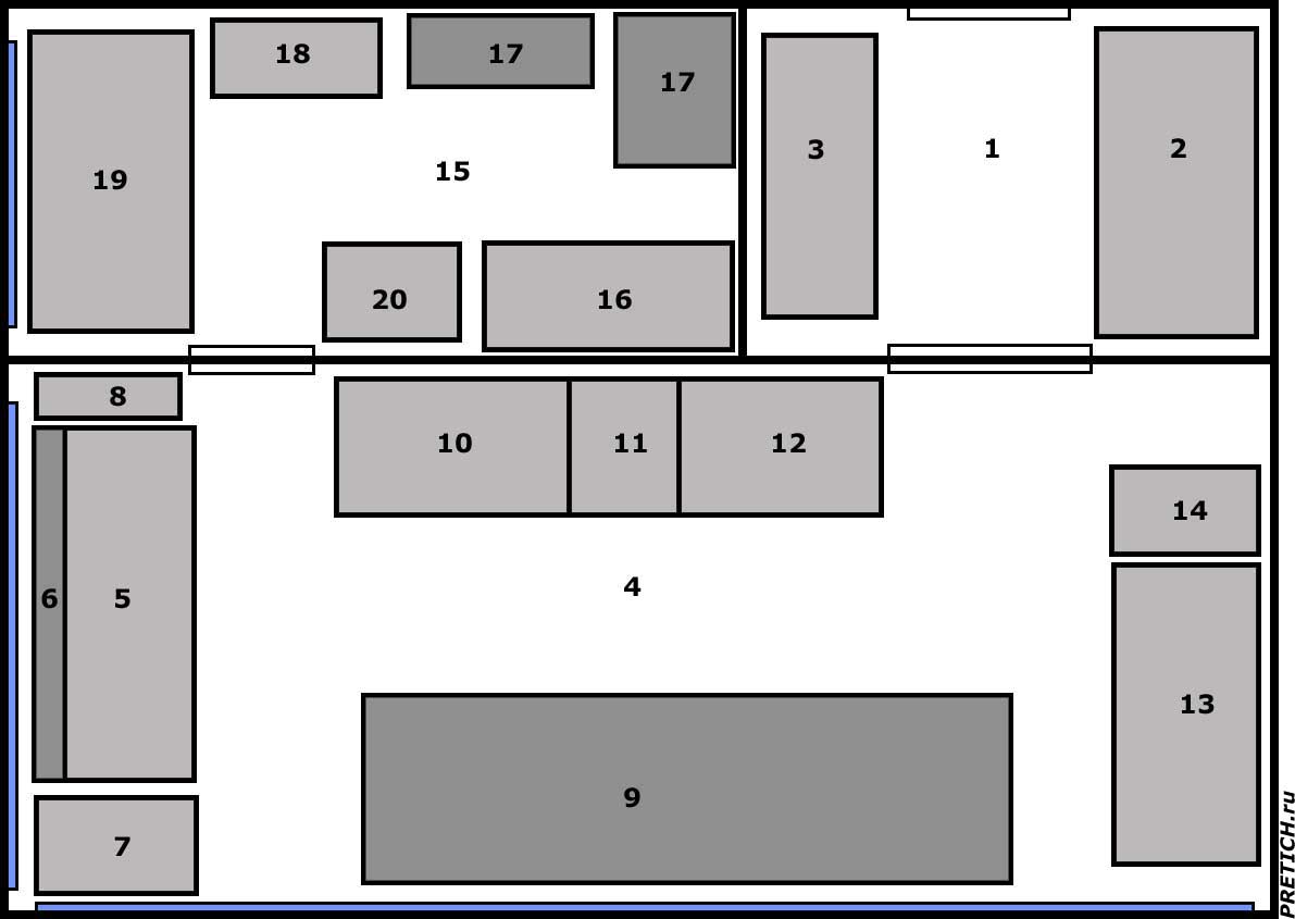 1 - условно говоря, прихожая с входной дверью; 2 - стальной верстак с мощными тисками, для грубых работ; 3 - заточные станки; 4 - большой зал; 5 - верстак на два рабочих места; 6 - полки с рабочим инструментом, запчастями и расходниками; 7 - аппарат точечной контактной сварки (какой-то компактный опытный образец); 8 - место для списанного инструмента; 9 - токарно-винторезный станок 16К20; 10 - плоскошлифовальный станок 3Е711; 11 - сверлильный станок; 12 - миниатюрный токарный станок, совмещенный с алмазным заточным кругом (там же бормашинка и электрограф); 13 - вытяжной шкаф, раковина с холодной и горячей водой; 14 - пескоструйный аппарат и муфельная печь; 15 - малая комната для ремонта точных приборов; рабочий стол с приборами и приспособлениями; 17 - два шкафа с поверочными инструментами, документацией, расходниками (спирт, вата, салфетки и прочее); 18 - место для отдыха; 19 - большая чугунная поверочная плита; 20 - малая поверочная плита, гранитная.
