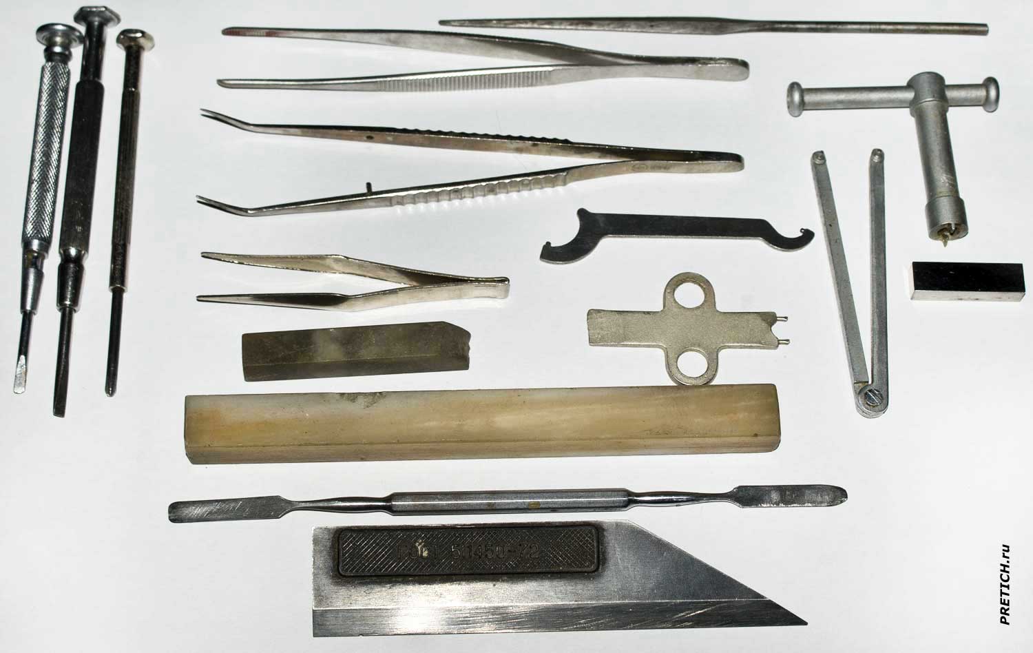 На фото 3. Некоторые инструменты: отвертки, пинцеты, специальные ключи, камни "Арканзас", лекальная линейка (по ссылке описание и ремонт лекальных линеек)...