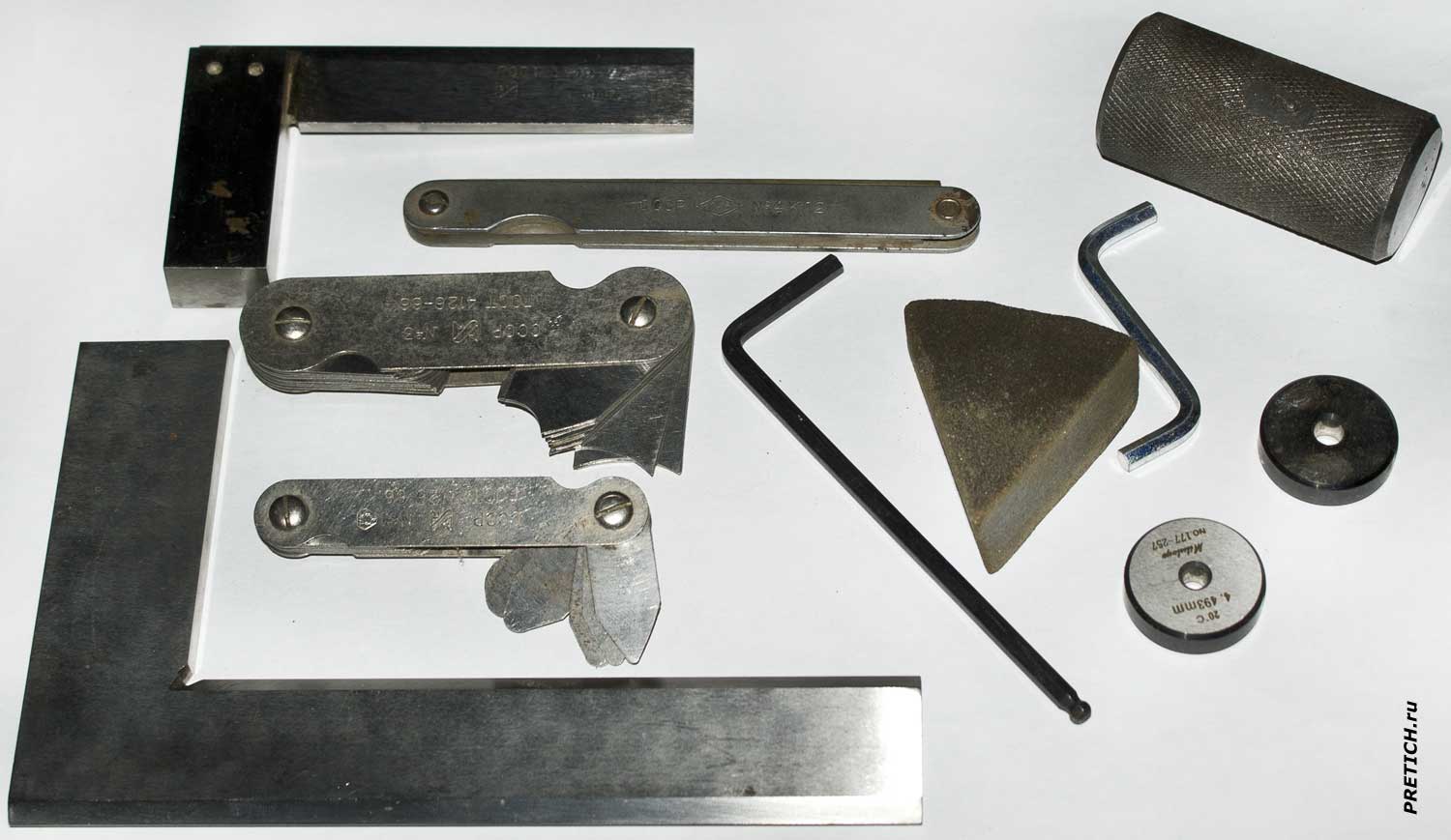 Фото 4. Угольники, щупы, шаблонные радиусомеры, ключи, сектор вулканитового круга, образцы для нутромеров, притир для микрометров (один из четырех).