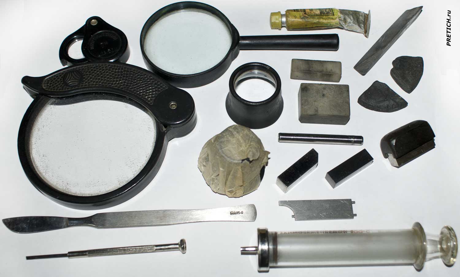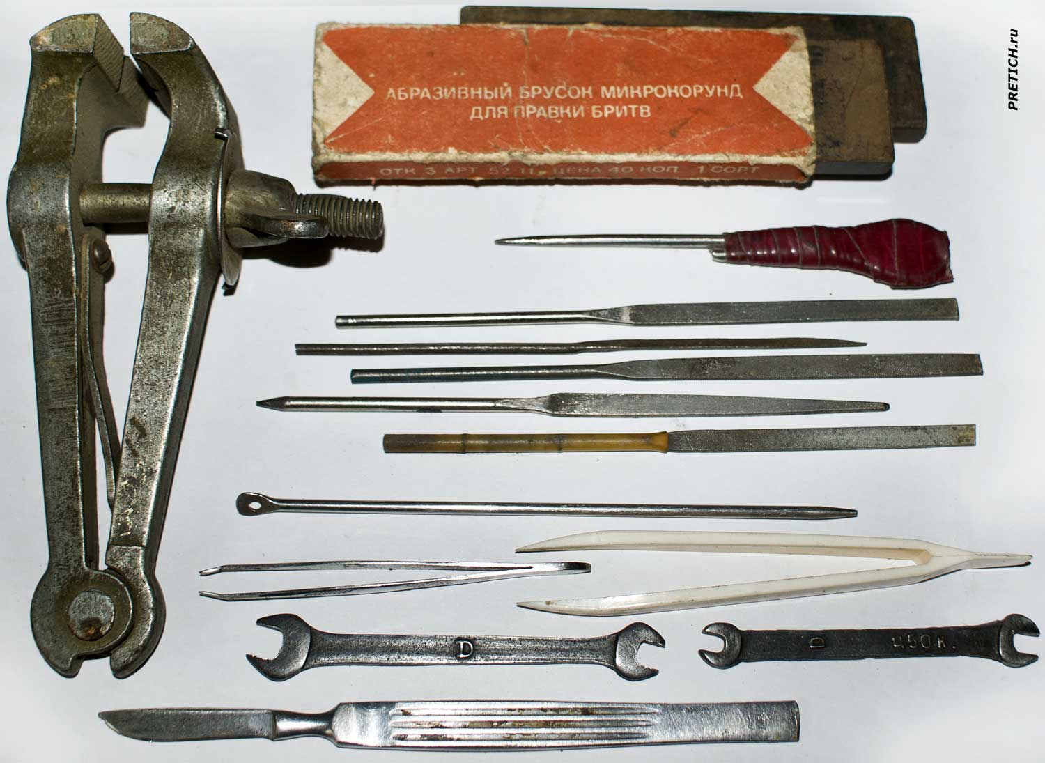 Фото 5. Ручные тиски, бруски из микрокорунда, шило, надфили, пинцеты, ключи, скальпель.