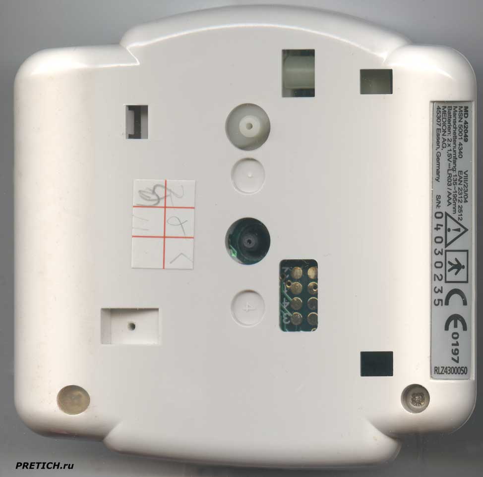 Сбоку на аппарате этикетка, на ней: название модели MD 42049. Дата изготовления VIII/23/04 - 16 лет назад... MSN 5001 4340 EAN 2312 2512 Manschettenumfang: 153~195mm. Питание 2x1.5V LR03/AAA. MEDION AG, 45307 Essen, Germany. Серийный номер. Два неведомых мне значка... знак CE 0197 RLZ4300050.
