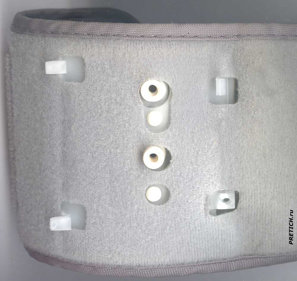 Это еще не разборка - надо снять манжету. На первый взгляд - это невозможно. Но она присоединяется к блоку электроники достаточно просто: три защелки и один винтик, два трубчатых разъема. Все, сняли. Вот манжета изнутри... и вот блок электроники изнутри... Отверстие с контактными площадками внутри - для заводского тестирования. Какая-то наклейка с чисто немецкими крякозябрами (у этих арийцев точно - свастика в генах сидит).