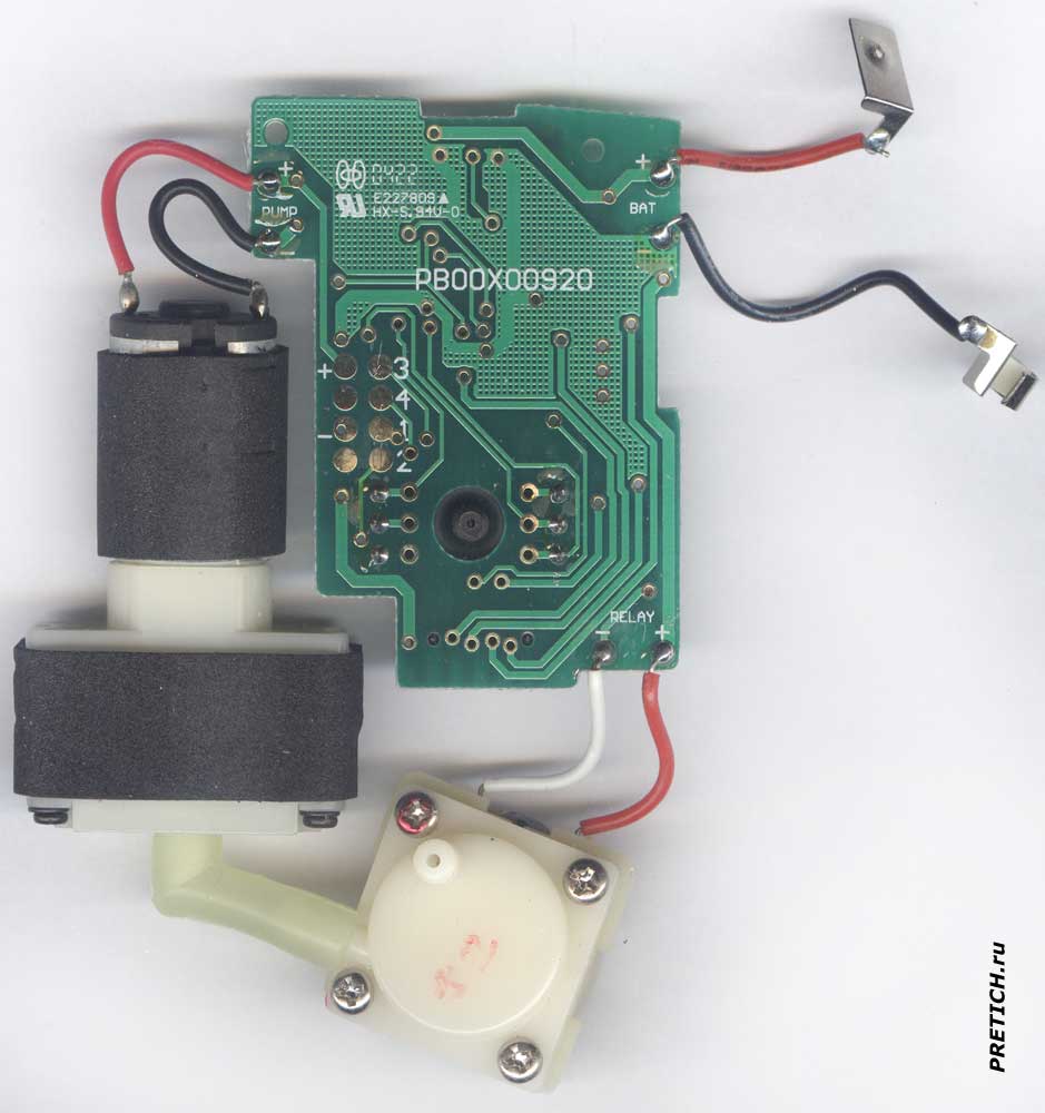 Откручиваем винтики, вытаскиваем два батарейных контакта, снимаем первую плату электроники, со второй они соединяются посредством колодки и штыревых разъемов. Вот так оно, в общем, и выглядит. На плате электроники маркировка: PB00X00920 E227809 HX-S. С этой стороны элементов нет - дорожки, припаяны провода - все подписаны, та самая контактная группа, что выходит наружу - под манжетой. Ну и два сосочка - также соединяющиеся с манжетой.