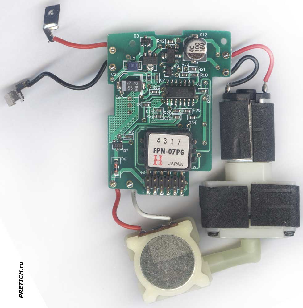 С другой стороны плату мы рассмотрим подробнее - здесь вся электроника. С этой стороны мы видим такие элементы: микросхема 4C46 324ARP - это операционный усилитель, потом диод 47-16 S3. Полимерный конденсатор 4C 100 16V. Много SMD элементов, среди них транзисторы: DK QC, C5S, H4 5D, BAY... Штыревой разъем - для соединения со второй платой, и рядом элемент, похожий на микросхему, сверху эластичная (гибкая) наклейка, похожая на алюминий, на ней - 4317 FPN-07PG H JAPAN - это датчик давления от японской компании Fujikura. В интернете на этот элемент есть даташит - можете его изучить самостоятельно.