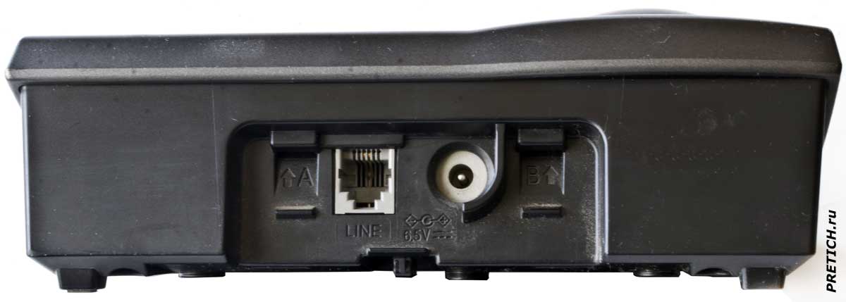 На задней стороне телефонный разъем RJ11 и разъем для блока питания на постоянный ток 6,5 вольта, полярность разъема тут же указана.
