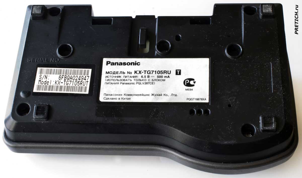 На нижней стороне базы две наклейки - одна со штрих-кодами и серийным номером, вторая этикетка, на ней: Panasonic модель KX-TG7105RUТ, требования по питанию - постоянный ток 6,5 вольт 500 mA. Как обычно попытки навязать свой товар - использовать только с блоком питания Panasonic PQLV207CE - словно нельзя использовать другой БП с такими же характеристиками! Сделано в Китае - естественно! Код еще - PQGT18878XA.