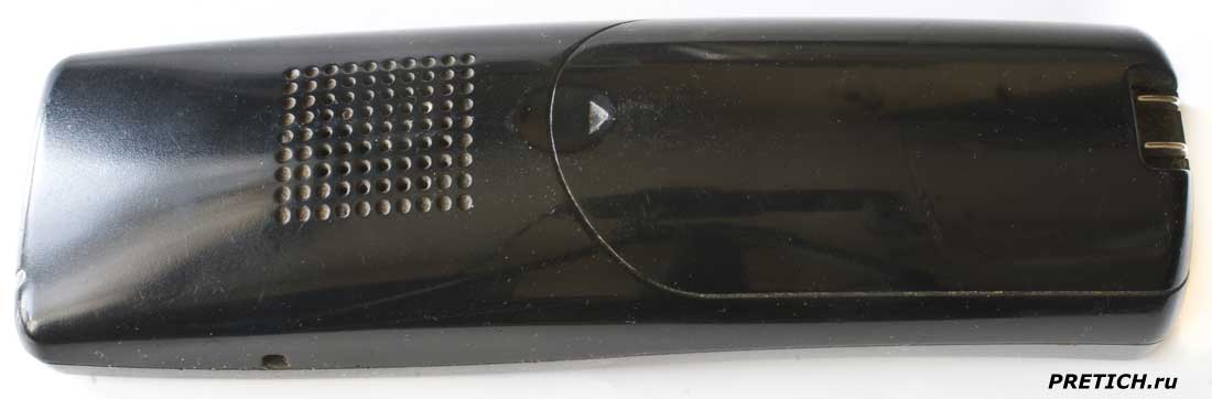 Трубка обычная: сверху вставка со светодиодом, индикатор зарядки. Затем отверстия динамика, затем экран ЖК-дисплея, затем 21 кнопка номеронабирателя и управления, плюс типа джойстик на четыре позиции - вверх/вниз, влево/вправо. В самом низу - отверстие микрофона. По бокам трубки углубления - их назначение мне неизвестно. В интернете есть подробное руководство эксплуатации этого аппарата на русском языке, но об этих углублениях ничего не сказано.