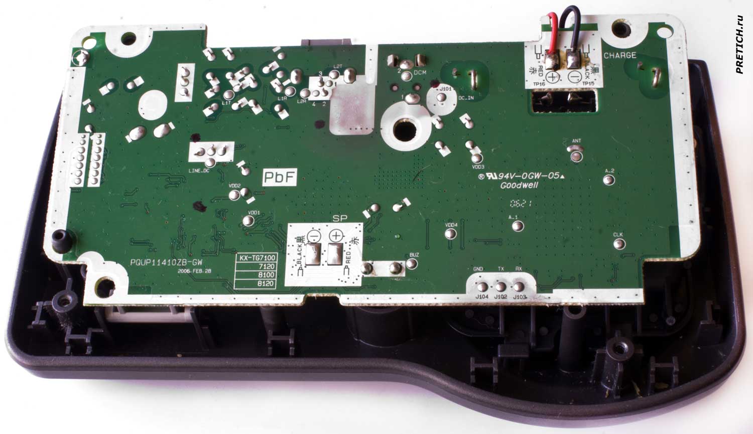 Смотрим вовнутрь - все смонтировано на верхней части корпуса базы. Это по сути одна плата электроники и еще пружинящие контакты, для соединения с базой. Вот на фото вы можете видеть эту плату. С одной стороны никаких элементов нет, маркировки: Goodwell, PQUP11410ZB-GW 2006.FEB.28 KX-TG7100.