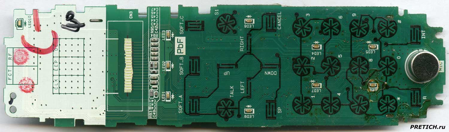 Вот голая плата трубки. С этой стороны располагался дисплей и матрица кнопок. Теперь видим светодиоды подсветки дисплея и клавиш. Контактные площадки номеронабирателя. Микрофон - обычный...