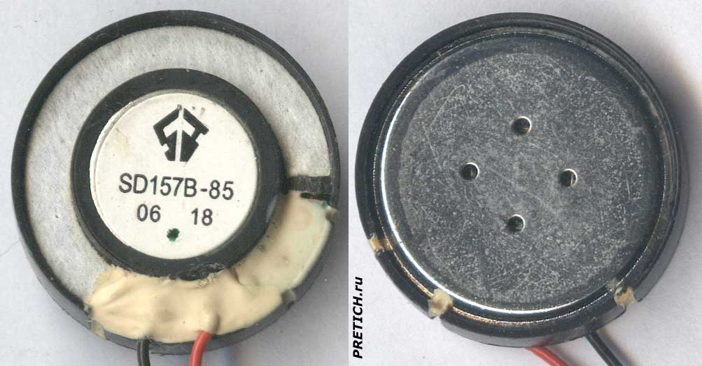 В трубке два динамика. Один маленький - обычный, пластмассовый корпус, на торце бумажная наклейка, на ней: SD157B-85 06 18 и неизвестный логотип. Диаметр этого динамика 20 мм.