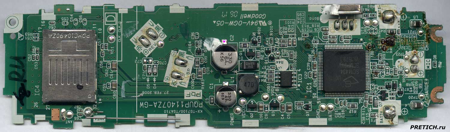 На обратной стороне платы маркировка: PQUP11407AZ-GW. Здесь микропроцессор почти такой же, как и на базе, но не совсем - SC14434 B2MP2VK... та же флэш-память 24C32AN, и тоже радиоблок в стальном экране.