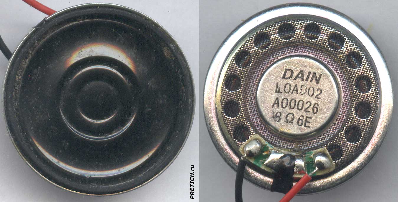 Второй динамик больше - это динамик громкой связи, его диаметр 28 мм. Сделан он гораздо более серьезнее. На торце, на экране магнитной системы маркировка: DAIN L0AD02 A00026 8Ω 6E.