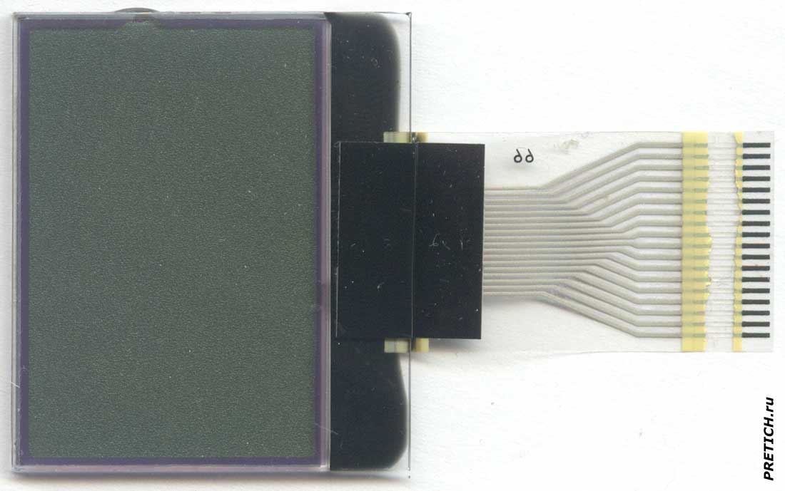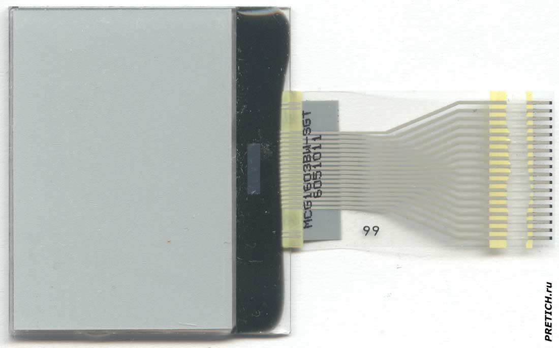 ЖК-дисплей - это стеклянная пластина 32х32 мм, но сам дисплей по диагонали 41 мм. На шлейфе маркировка: MCG1603BW-SGT 6051011 99. В аппарате он расположен в пластмассовом корпусе, на нижней части пластина из оргстекла - световод, с подсветкой...