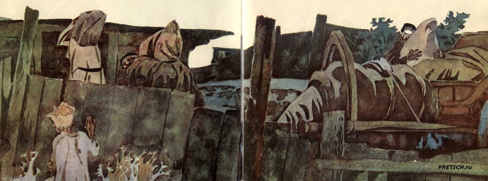 Форзац, передний и задний - он показывает прошлое и настоящее деревни... ручной каторжный труд и пришедшие на помощь машины...