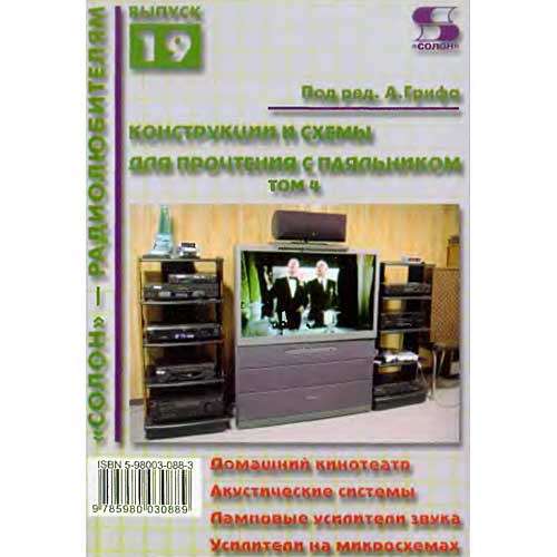Конструкции и схемы для прочтения с паяльником, том 4, выпуск 19. Серия СОЛОН - радиолюбителям. Автор-составитель Арнольд Яковлевич Гриф. В книге представлены: Домашний кинотеатр, Акустические системы, Ламповые усилители звука, Усилители на микросхемах. Издательство СОЛОН-ПРЕСС, Москва 2003 год.